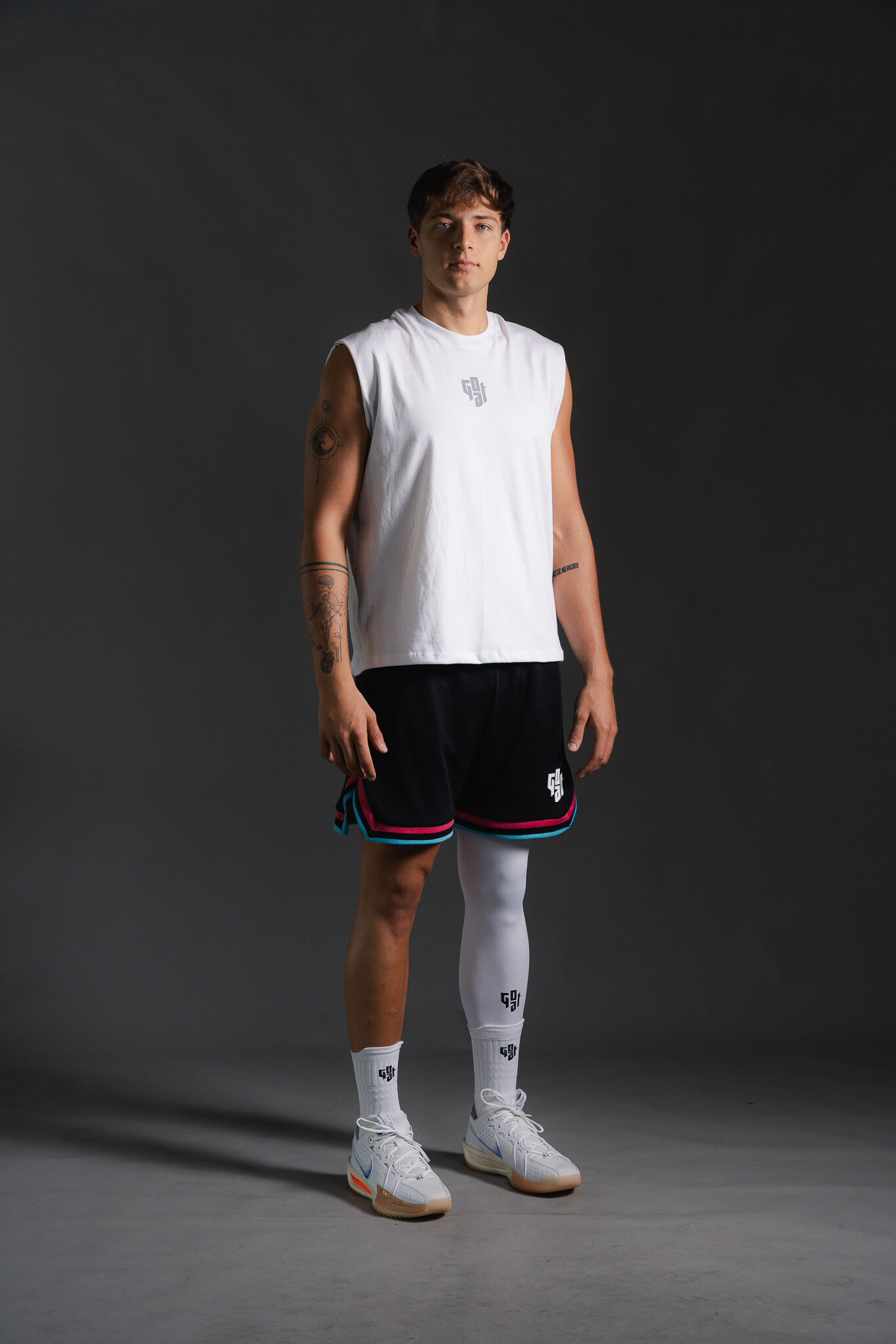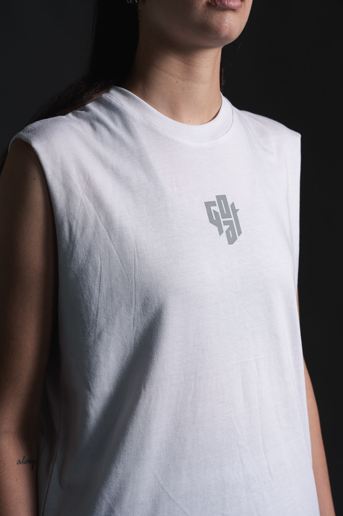 Musculosa de algodón de primer nivel con estampado GOAT en el frente. El modelo mide 1.90 y está usando talla XL.